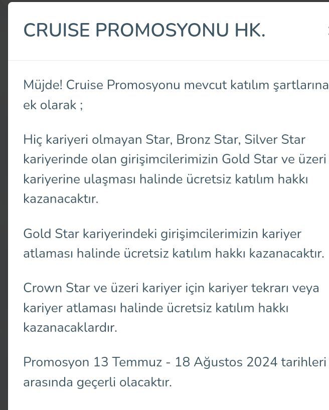 Sevgili arkadaşlar az önce toplantıda açıklandı, şirketimiz Cruise gezisine herkesi götürmek istiyor. Bu nedenle gold ve üzeri kişiler kariyer tekrarında, ilk kez gold olacak kişiler bedava gidecek.
