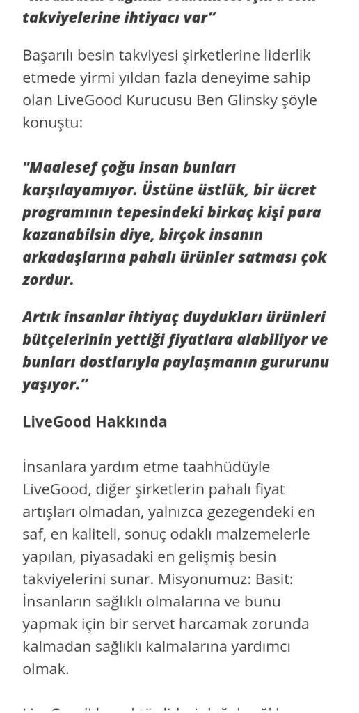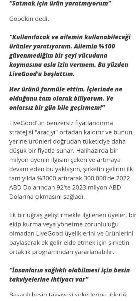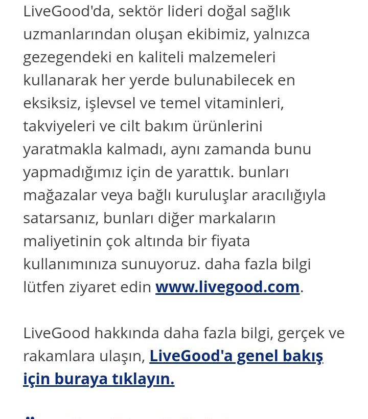 2 yılda Dünyada 1.6 milyon aktif abonesi ile Livegood Türkiye’de henüz yeni Crown Diamond seviyesinde kimse henüz kimse yok Türkiye gibi büyük pazarda en az 2 yıl içinde Crown Diamon seviyesinde 10 kişi çıkacaktır bunlardan biri olabilirsin , bu boş pazarda erkenden yerininalmak için aşağıdaki linkten ve profilimden detaylara ulaşabilirsiniz 👇